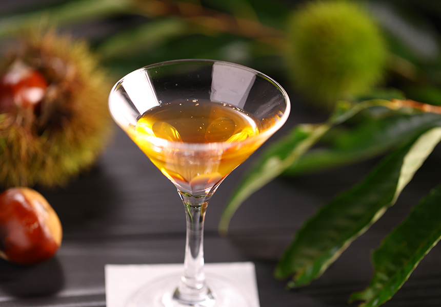 グラスの底に忍ばせたカシスリキュールが、時とともに色彩と味わいを変化させ、まるで茜色に染まる空の移ろいを映すよう。