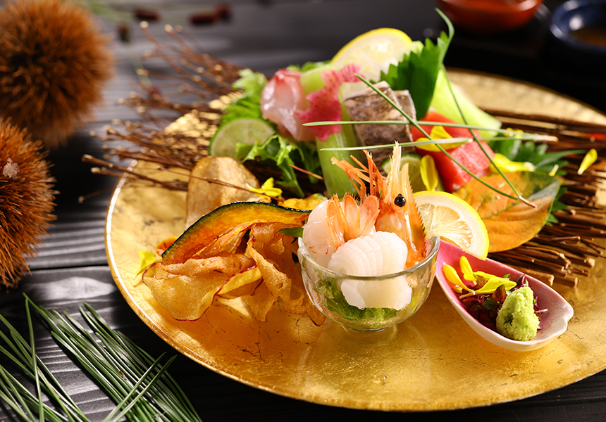 秋のお献立は、山々が赤や黄色に色づき始める湯河原を題材に、旬の食材や器を使用し、目でもお楽しみいただける時間を演出致します。